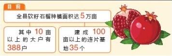 歷經(jīng)了10多年的選育、種植、示范,永勝縣的軟籽石榴產(chǎn)業(yè)已初具規(guī)模。目前,全縣軟籽石榴種植面積達(dá)5萬畝,其中種植面積在10畝以上的大戶有388戶,建成100畝以上的連片基地35個(gè)。