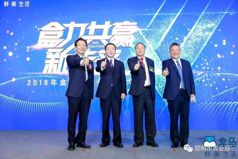 從左到右依次:云南省省委農辦主任、農業(yè)廳廳長王敏正,湖北省農業(yè)廳黨組書記、廳長肖伏清,山東省農業(yè)廳副廳長褚瑞云,盒馬CEO侯毅