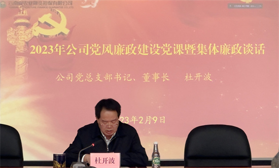 2月9日,云南省農(nóng)業(yè)融資擔(dān)保有限公黨總支部書記、董事長杜開波在公司年度工作會議上,為全體職工上了一堂黨風(fēng)廉政建設(shè)專題黨課,并作集體廉政談話。省公司全體職工、州市分支機構(gòu)負(fù)責(zé)人、主管等現(xiàn)場聽課,各州市分支機構(gòu)全員通過視頻方式聽課。